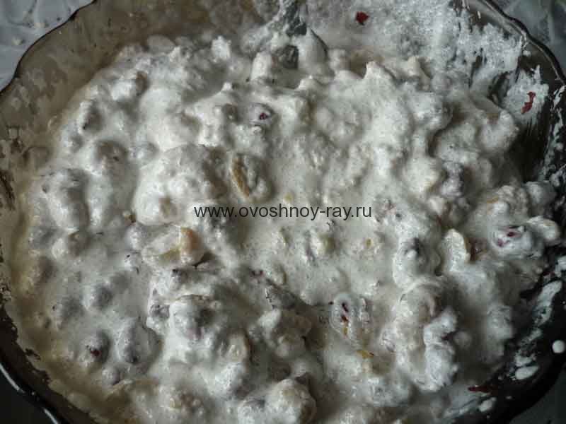 Далее соединяем очищенные орехи со взбитым белком и, уже все вместе, взбиваем снова.