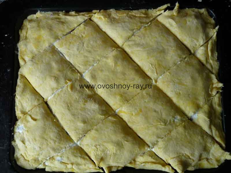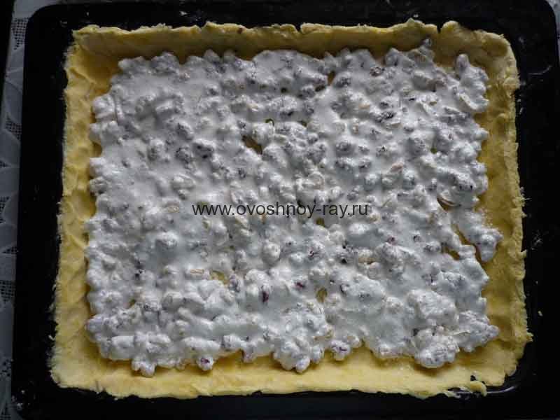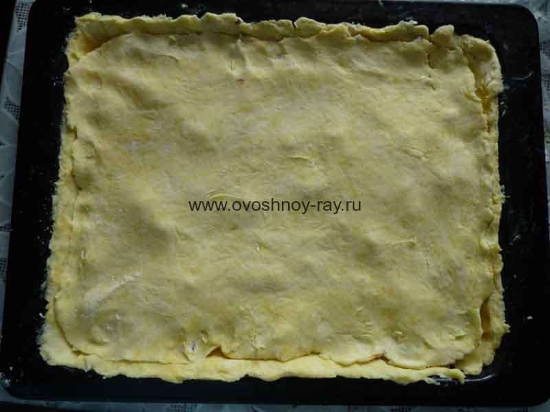 Раскатываем одну из 3 заготовленных нами частей теста, сверху выкладываем половинку начинки,