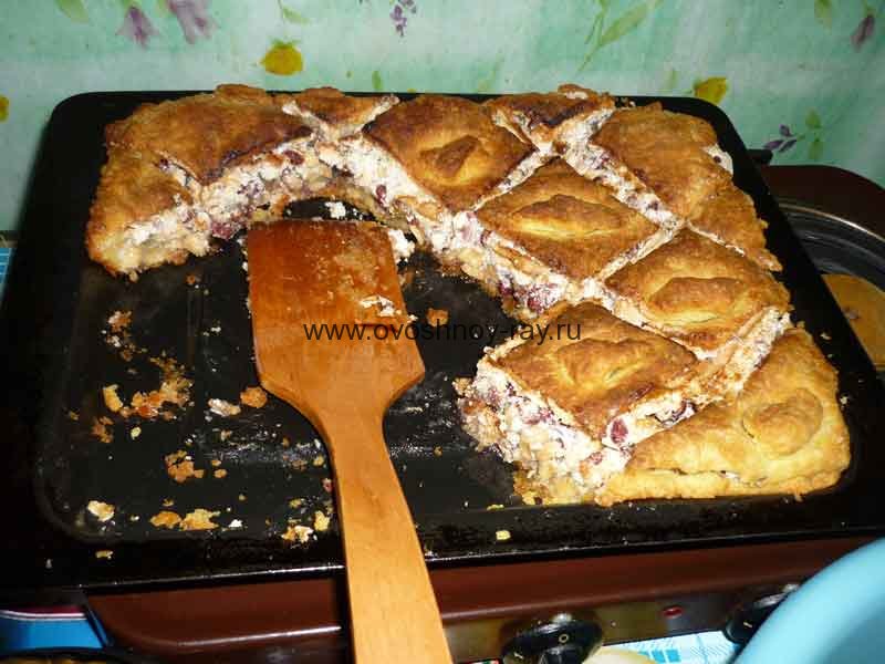 закрываем второй частью теста, снова выкладываем оставшуюся начинку, закрываем все третьей частью теста.
