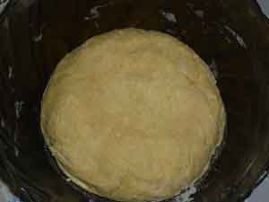 Все перемешиваем до образования однородной массы. На первый взгляд, тесто может показаться очень сухим и трудным при приготовлении. Продолжайте вымешивать и постепенно Вы увидите, что муки можно даже и добавить. Можно еще пол- стакана. Тесто это не должно липнуть к рукам, а также к посуде. Если тесто продолжает липнуть- добавьте еще муки. Оно должно быть достаточно плотным по консистенции, иначе пропускать его через мясорубку (да-да, это делать придется) будет весьма затруднительно, если не сказать хуже.
