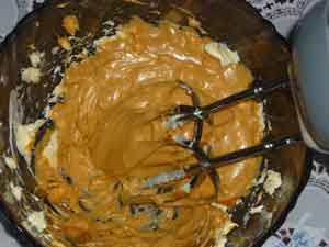 Пока остывает наше тесто- можно заняться кремом. Масло сливочное и немного размягченное нужно взбить миксером, понемногу добавляя вареное сгущенное молоко. Все хорошо взбить до светло-коричневого цвета. В принципе, можно использовать только сгущенное вареное молоко, без масла.
