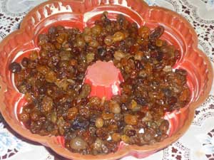 Для начала подготовим изюм. Для этого его надо замочить в горячей воде на полчаса. После чего тщательно промыть под проточной водой и обсушить.