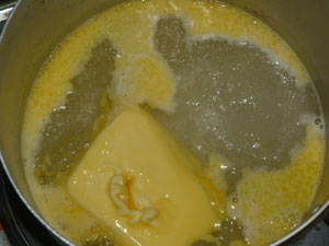Воду закипятить в кастрюле, добавив щепотку соли. Затем добавляем сливочное масло, кипятим немного.
