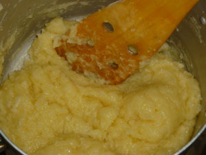 Снимаем с огня и остужаем до теплого состояния. Затем, по одному, вбиваем яйца и очень хорошо размешиваем. Затем добавляем следующее яйцо.