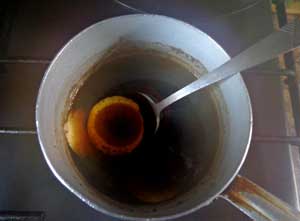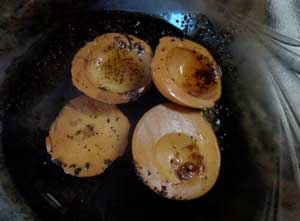 Отдельно поставим вариться черный чай. Вливаем в среднюю кастрюльку триста миллилитров воды, ждем, когда она закипит. Бросаем туда два пакетика черного чая и варим его около пяти минут. Далее отделяем белок (шляпку гриба) от желтка, закладываем шляпки в горячий чай,
