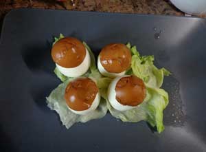 Данные грибочки подходят как для украшения ваших любимых салатиков, так и просто служат закуской. Например, мы украшаем ими салат оливье, очень даже красиво получается. Но в основном бывает такое, что остаются лишние вареные яйца и, чтобы не оставлять их лежать в холодильнике, мы делаем вот такие замечательные грибочки. Главное в данном блюде это то, что яйца очень хорошо должны очищаться. Для этого подержите их немножко под проточной холодной водой, после того как отварите их. Но бывает и это не помогает. В этом случае Вас выручит майонез, который с легкостью покроет некрасивую шероховатость у белка. В общем, приступим к приготовлению грибочков.