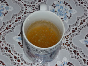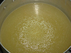 В еще горячий бульон вводим желатин и, при нагреве, растворяем желатин полностью в бульоне. До кипения не доводим. Снимаем с огня и чуть остужаем будущее желе.