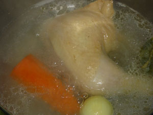 - морковь для украшения варим вместе с курицей. Вынимаем ее по готовности, так как морковь варится быстрее, чем курица.