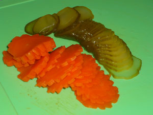 Морковь, которая варилась вместе с курицей, нужно фигурно нарезать. Нарезаем кружочками соленый огурец,