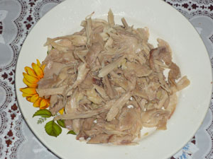 Куриное мясо режем кусочками. Я просто разделила мякоть на волокна, но мне это в дальнейшем не очень понравилось. Поэтому советую все же порезать кусочками.