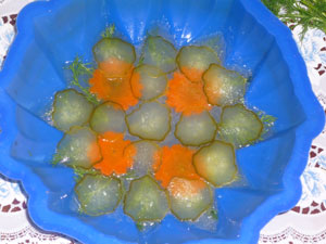 Остужаем полностью пару часов. Затем, чтобы вынуть желе из формы, опускаем ее на полминуты в горячую воду. Лично у меня вытащилось из силиконовой формы без этой процедуры. Но лучше не рисковать. Декорируем желе зеленью, если Вам этого хочется.