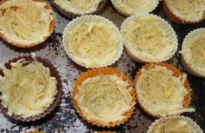 Начинаем делать корзиночки: очищаем картошку, моем ее хорошо, после чего обсушим и натрем на терке, желательно на крупной. Затем отжимаем весь ее сок, он нам не нужен. Отдельно натираем сыр, тоже на крупной терке и смешиваем его с нашей картошкой. Добавляем к ним одно яицо и соль, перемешиваем, чтобы получилась густая картофельная масса. Теперь картофельной массой выкладываем внутри формочки для кексов, ну или в другие формочки, главное чтобы они были, как корзинки.