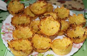 Нагреем до 200 С духовку, застелем противень бумагой для выпечки, положим на нее наши корзиночки и поставим в духовку на двадцать минут. Затем вынимаем картофельные корзинки из формочек, даем полностью остыть, просто отложив в сторонку.