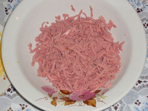 Колбасу вареную трем на крупной терке. Резать кубиком не рекомендую, поскольку колбаса будет вываливаться из нарезанного рулета, к тому же сам рулет будет свернут недостаточно плотно. Лучше не полениться и натереть на терке.